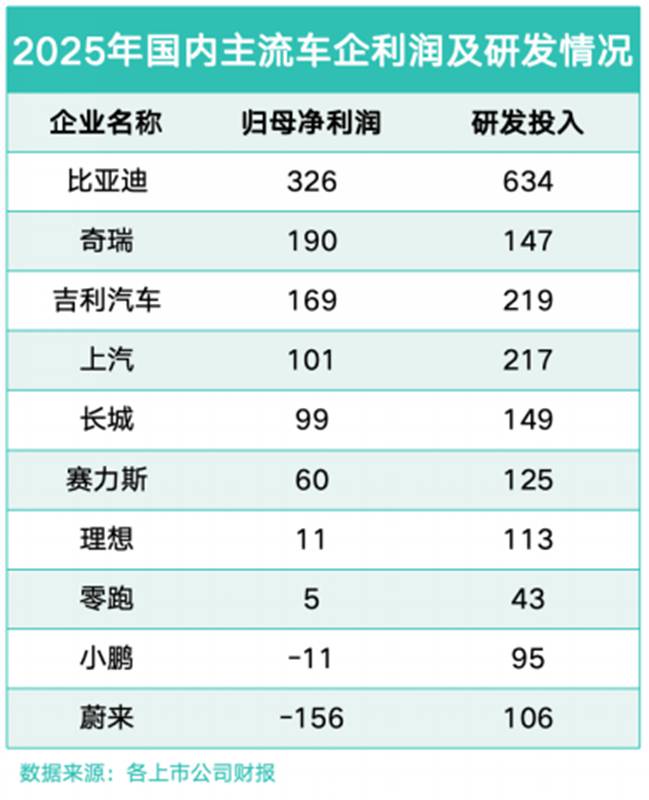 研发投入的差距,成为头部车企竞争力分化的“胜负手”。2025年,比亚迪研发投入达634亿元,同比增长17%;吉利、上汽、长城、奇瑞研发投入分别为219亿元、217亿元、149亿元、147亿元,分列第二至五位。值得注意的是,比亚迪一家的研发投入,已超过吉利、长城、奇瑞三家企业的研发投入之和。
