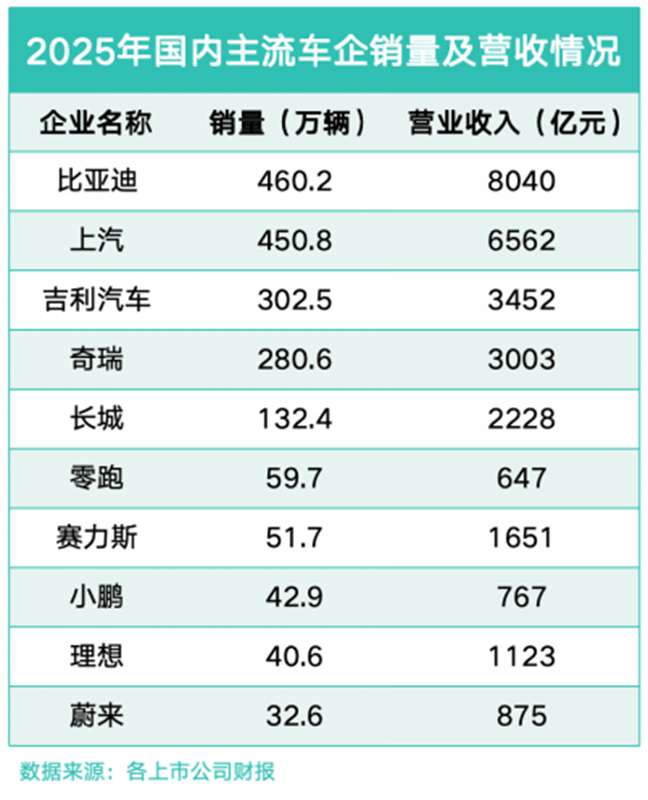 从营收维度来看,头部车企的规模优势进一步凸显。比亚迪以8040亿元的营收规模稳居行业榜首,上汽、吉利、奇瑞、长城依次位列第二至五位。这背后,离不开销量的稳健增长。2025年,比亚迪销量达460.2万辆,连续多年保持高增长态势。上汽集团、吉利汽车、奇瑞汽车、长城汽车分别以450.8万辆、302.5万辆、280.6万辆、132.4万辆紧随其后。